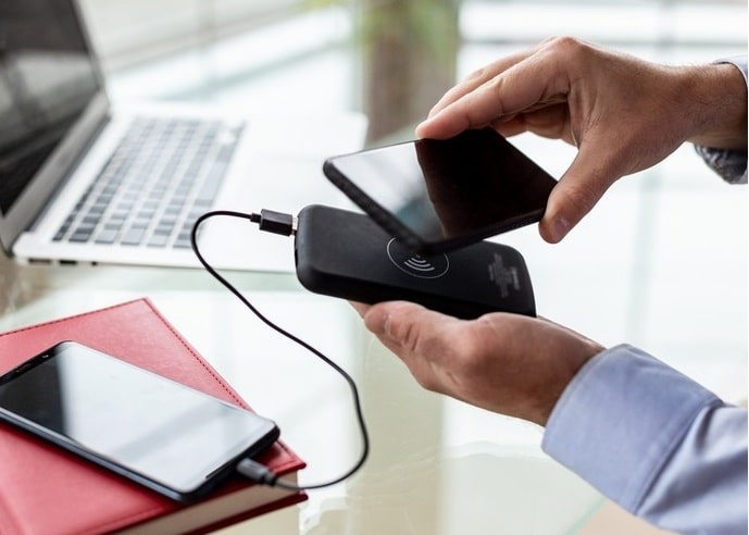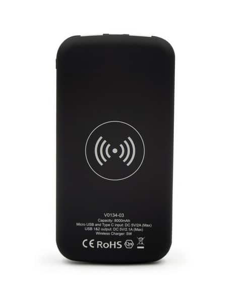 Bezprzewodowy power bank Mauro Conti 8000 mAh, ładowarka bezprzewodowa 5W, działa z urządzeniami posiadającymi możliwość ładowania indukcyjnego, wejścia (max. 5V/2A) USB-C oraz micro USB, 2 wyjścia USB (max. 5V/2.1A) do ładowania dwóch urządzeń jednocześnie, cyfrowy wyświetlacz poziomu naładowania, grawer ukazuje podświetlaną powierzchnię, etui i kabel micro USB w komplecie, w ozdobnym pudełku na magnes, V0134-03