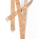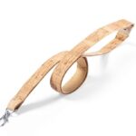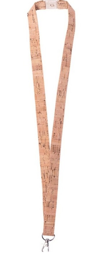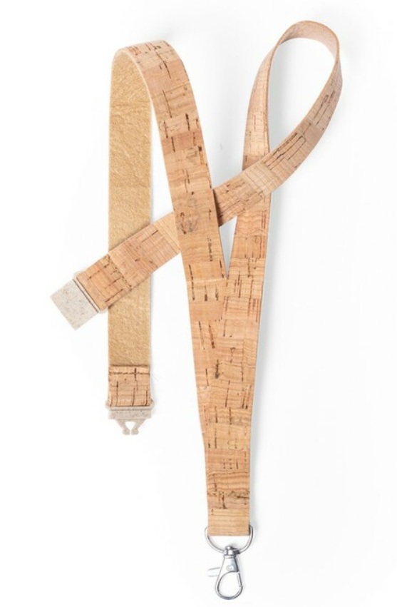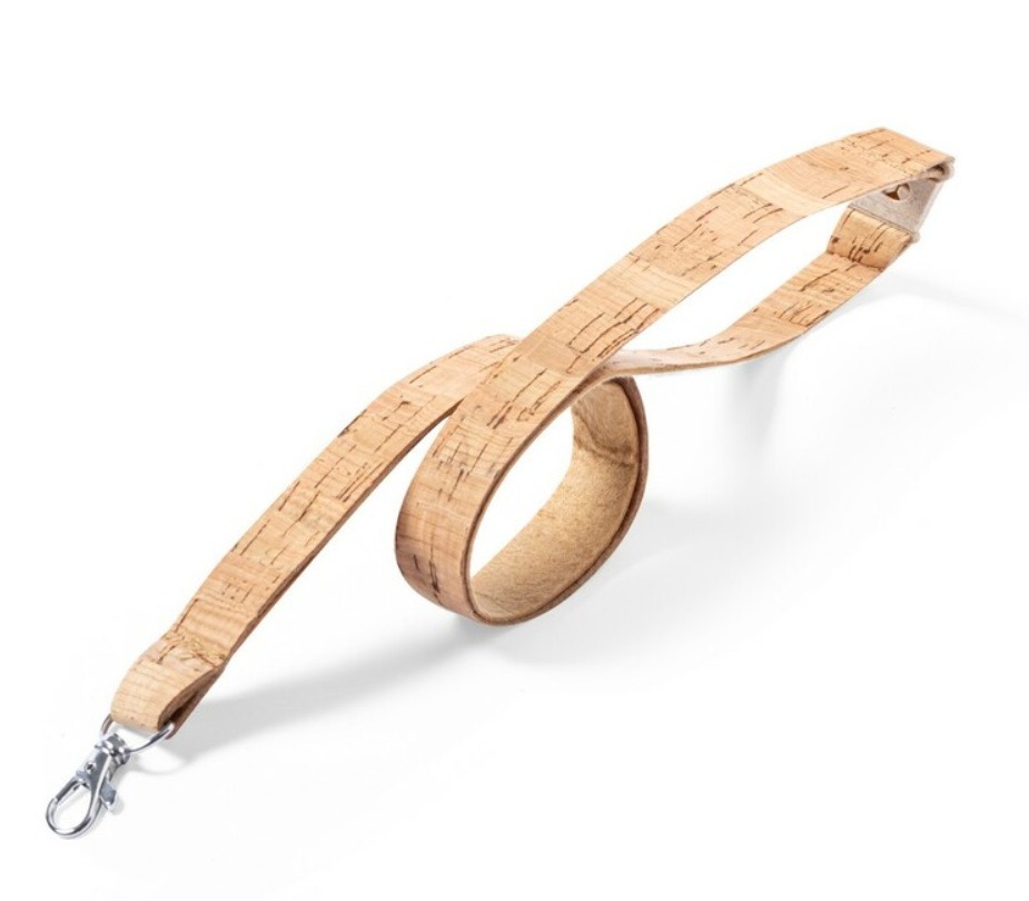 Smycz reklamowa, posiada rozpinany zatrzask bezpieczeństwa zapobiegający zaciśnięciu smyczy na szyi, wykonana z korka, elementy z włókien słomy pszenicznej i PP, metalowy karabińczyk umożliwiający przypinanie