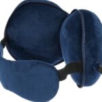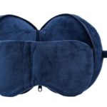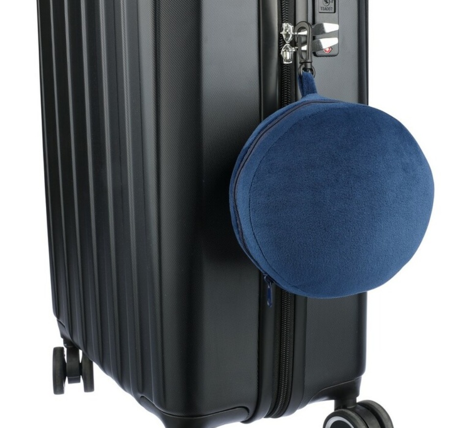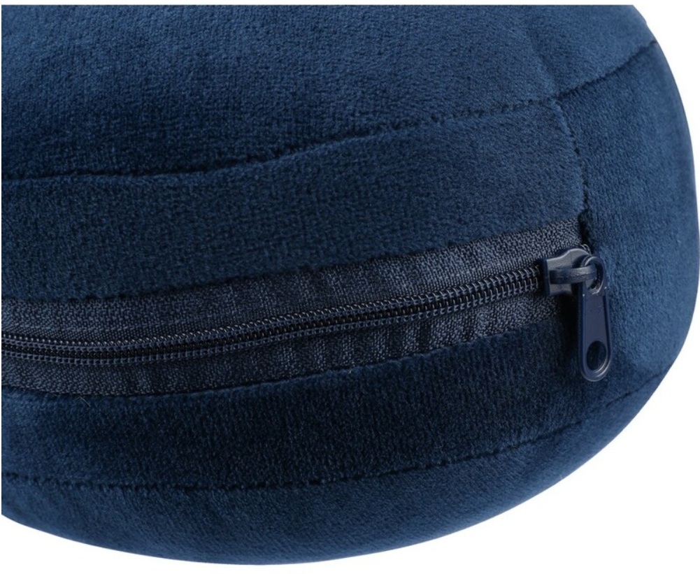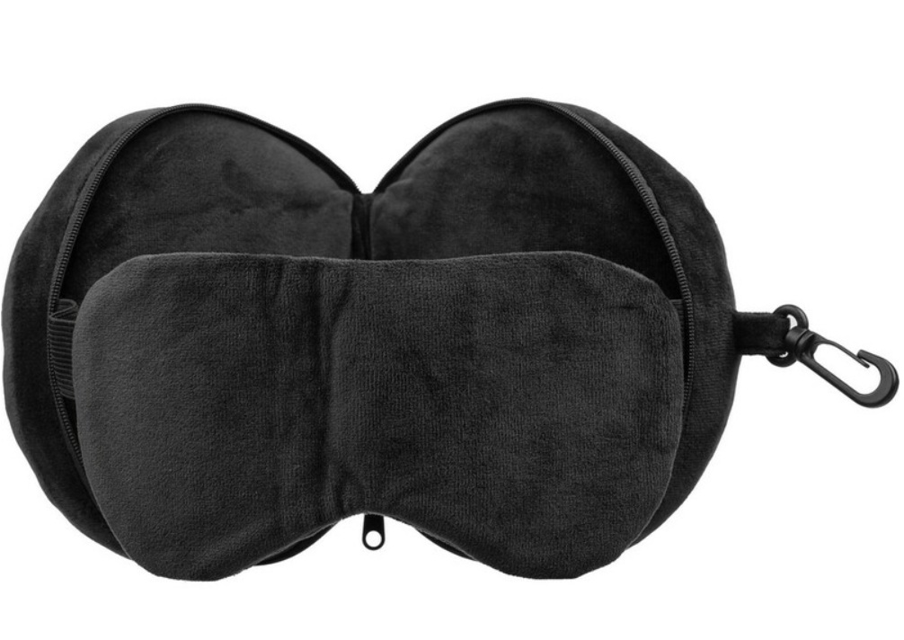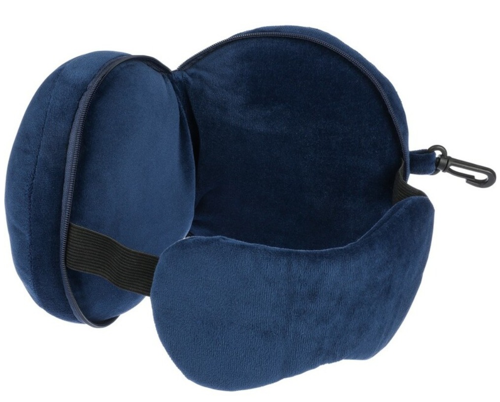 Poduszka podróżna, zawiera opaskę na oczy, po rozpięciu zamienia się w poduszkę, wyposażona w karabińczyk, umożliwiający łatwe przymocowanie podczas podróży, wykonana z miękkiego poliestru i wypełniona bawełną PP